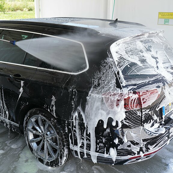 Spült Schmutz und Reinigungsmittel vom Fahrzeug.